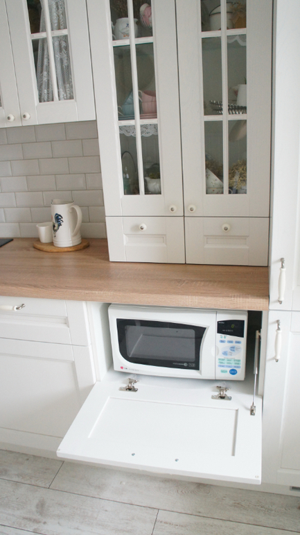 Микроволновка в этом стиле кухни не смотрелась,спрятали ее сюда.Оказалось весьма удобно.