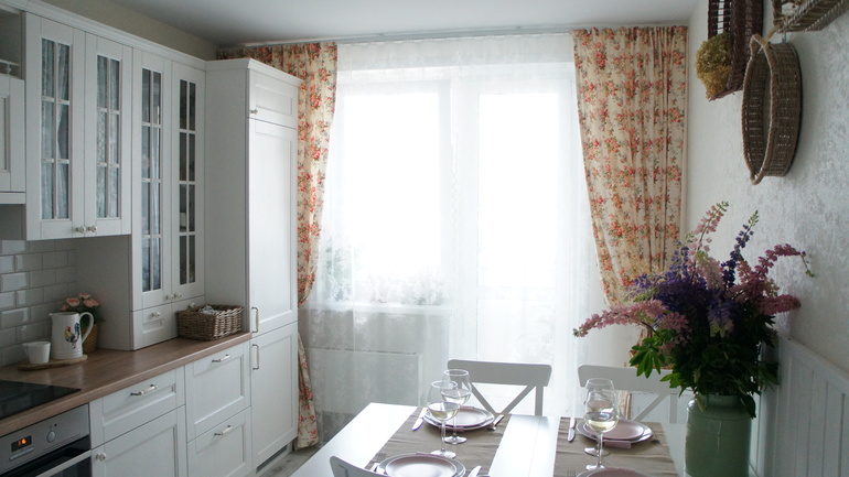 Мне тоже нравится такой стиль. Можно вопрос? Какое расстояние у вас от шкафа (или холодильника) до стены с окном? Я смотрю, там занавеска. Вы при проектировании учитывали это сразу?