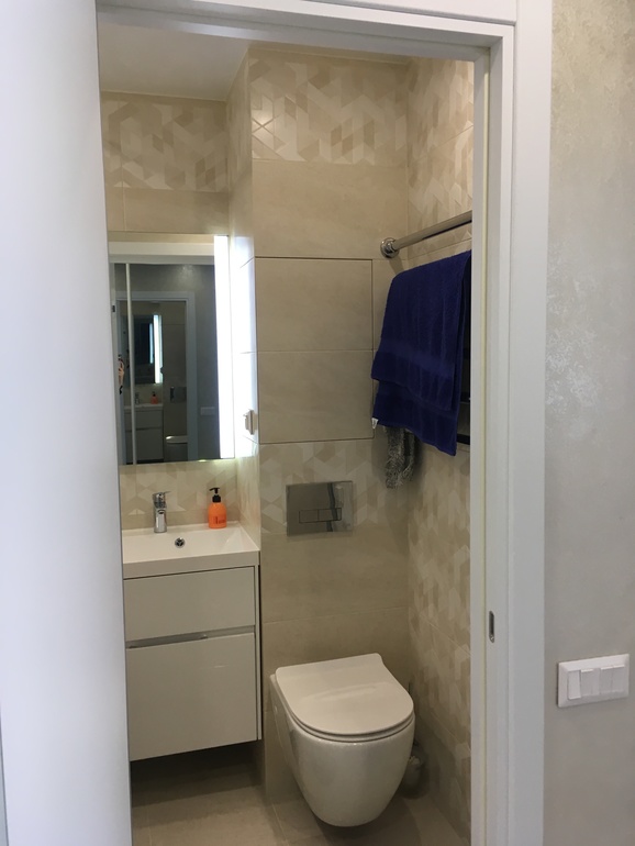 Заказчик обратился ко мне с просьбой помочь в отделке. Все планировочные решения уже были готовы, электрика и сантехника разведены. (так бы я стиралку впихнула в санузел). На мой взгляд, хороший вариант перепланировки коридора вышел у него.