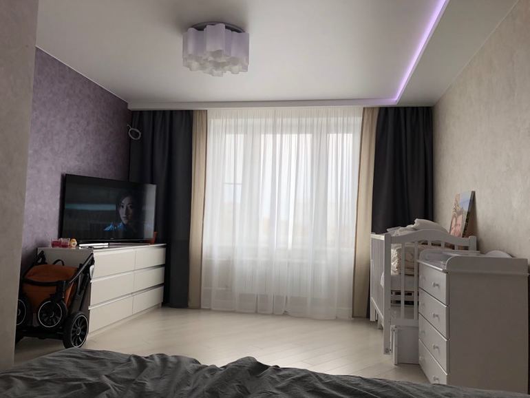 Обращу внимание на потолок - он двухуровневый, хотя высота потолков в этой квартире всего 2,6 м. Нижний уровень идет углом, в той части комнаты, где человек не ходит, а сидит или лежит. Поэтому, визуально потолок не давит. Ну и два уровня дали возможность сделать закарнизную подсветку