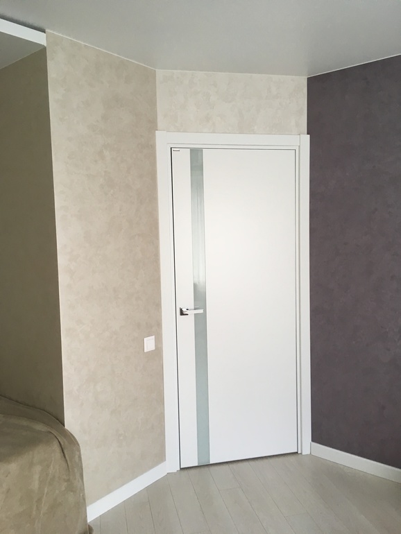 Маленькая, с большим количеством дверей. Сразу решили делать в прихожей декоративную штукатурку, чтобы легко было за ней ухаживать. Заказчику она очень понравилась и всю квартиру закатали в нее.