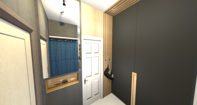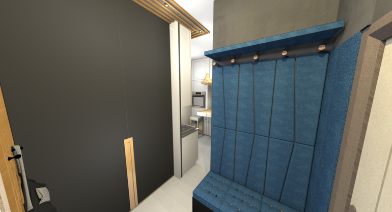 Решение с прихожей по мне очень спорное. Открытые вешалки, на них будет висеть одежда, все это отражается в зеркале... Я бы сделала закрытый шкаф, наличие пуфа вообще необязательно при такой небольшой площади. Глубина небольшая, да, но можно поставить шкаф с распашными дверьми, какие-то из них сделать зеркальными