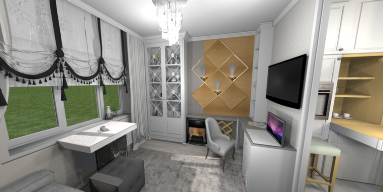 А сервант парню бедному зачем? )) Подаренную мамой посуду хранить.Я бы его убрала и напротив дивана телевизор в гостиной поставила, а сверху ноута телек бы убрала.Под телевизором можно сделать как раз искусственный камин продольный на 90 см.Он будет смотреться красиво, и выглядеть впихнутым не будет.Кухня тоже глаз резанула.Вы телеком всю стенку "поели".Телек уже давно можно над вытяжкой встроить и там можно так сделать, а во вторых есть место под плиту с духовкой.В Верхние полки можно как рах встроить свч, кофемашину, вытяжку.А столик со стеллажами я бы убрала.Проще поставить обычный маленький, что бы хоть на троих хватило.И на стену эту же как наверху сделать бы полки для хранения.Мне кажется, что балкон как то не нашел своего применения.Один комод и шкаф там что ли ? Я бы туда рабочую зону бы со компом убрала.А диван в гостиной побольше бы сделала.Боковой столик заменим журнальный круглым столиком или пуфиком.А так мне понравился проект.