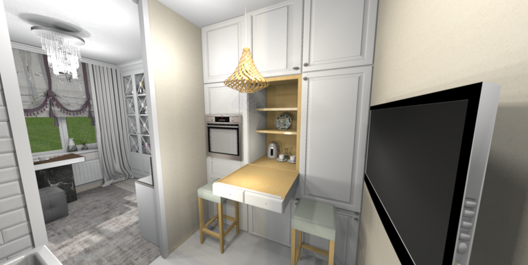 Мини-кухня. Откидной столик, встроенный холодильник, духовка. На верхнюю полку в стеллаже можно разместить микроволновку.