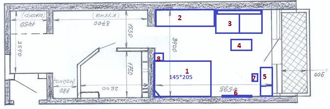 Места немного, можно попробовать так. 1- кровать, 8 - тумбочка, с другой стороны кровать примыкает к стене, но можно сделать маленькую навесную полочку в углу. 2- шкаф, 3 - небольшой диван (если будет раскладываться вперёд - то чтобы не больше 220 см в длину). 4 - маленький обеденный стол, 5 - письменный стол не длиннее 120 см и с ящиками справа, 6 - телевизор, 7 - стул для письменного стола. Стулья для обеденного не рисовала. Ну и "больших семь шапок из овцы не выкроить никак" :)