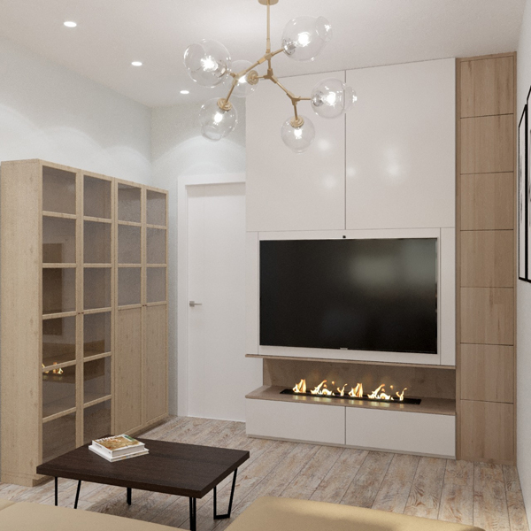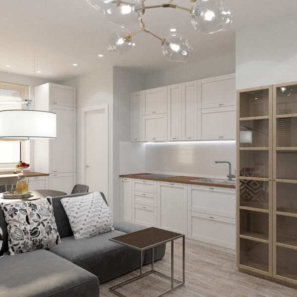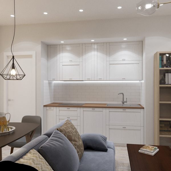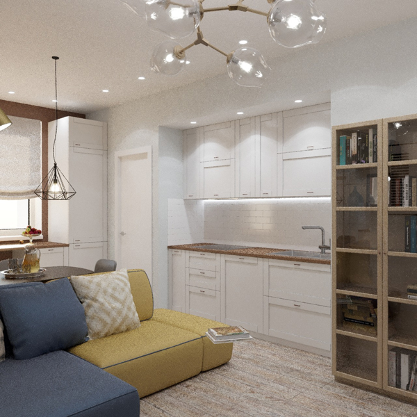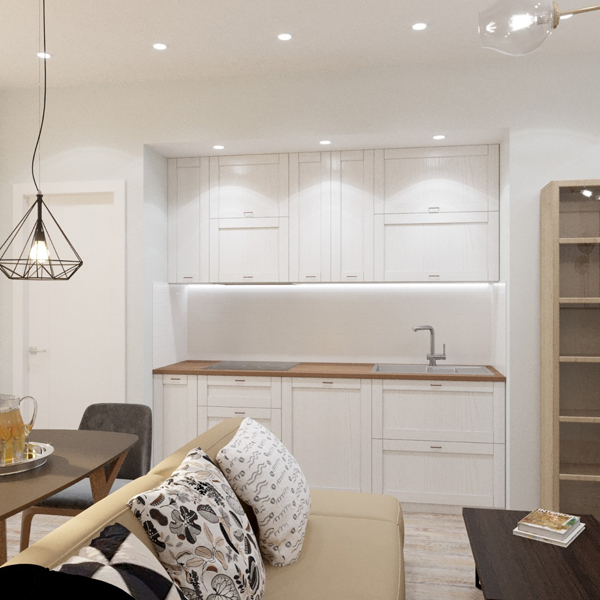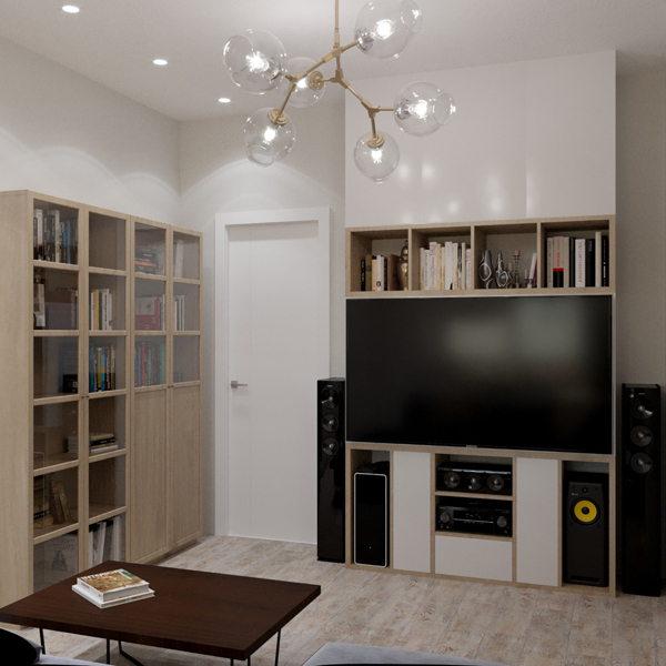 нужно разместить тв, кухню, не заступая в нелегальную площадь, , стол, диван, колонки, компьютер.