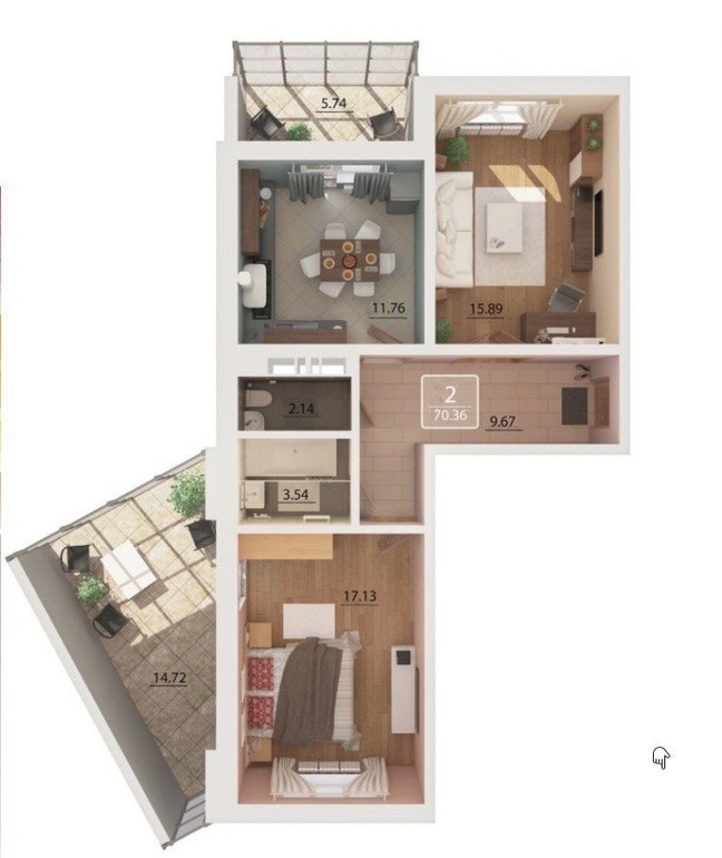 имеется вот такая планировка, есть второй балкон -лоджия и она почти 15 квадратов, правда форма не правильная, но все же
