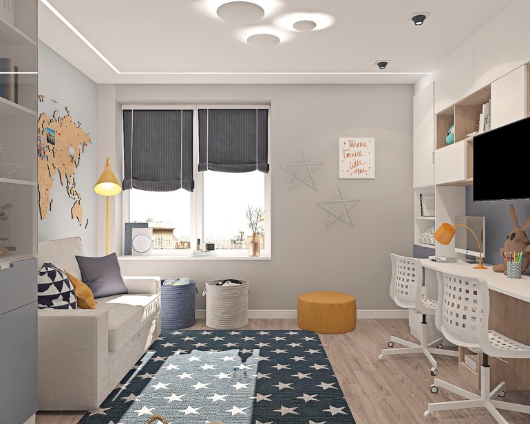 спасибо. У детей будет еще одна комната спальня, там помимо кроватей будет шкаф и комод для одежды, а так же спортивный уголок. Мы решили его вынести в другую комнату, чтобы эту не нагромождать.