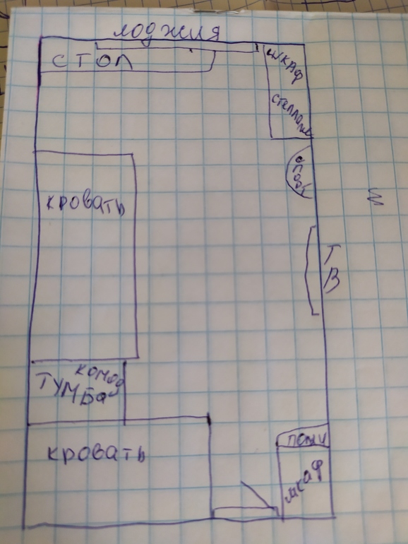 Слева от входа- комод, над ним ТВ, какие нить пацанячьи полки, и угловой шкаф