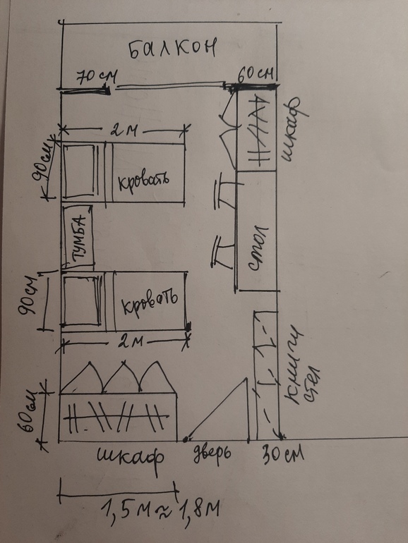 Думали справа 2 кровати углом, большой стол вдоль окна. 2 шкафа по правой стороне, каждый спрятать за дверями( входной и балконной)