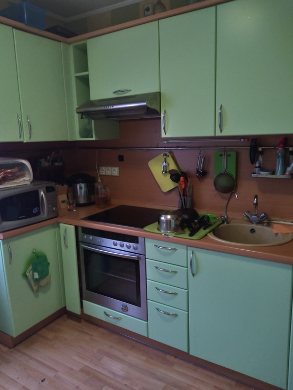Я бы сменила ручки на шкафчиках на что-то более стильное. Кухня базовая и с новыми ручками заиграет. Смешила бы столешницу и фартук, вижу тут белый, чёрный цвет, либо дерево с явной текстурой, что-то бамбуковое. Продумать в ящиках хранение так, чтоб максимально разгрузить поверхность, ощущение захламленности, хотя все чисто. простую тюль без рисунков, и матовые зелёные шторы