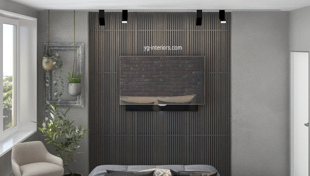 Для остальных стен мы взяли холодный, благородный серый. Он уравновешивает достаточно агрессивный кирпич, а так же дает ему очень выигрышный фон.