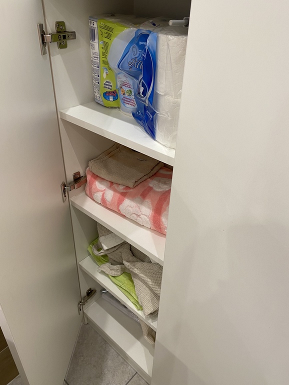 Слева закрытые шкафчики. Там спрятана всякая бытовая химия, утюг, фен, тряпочки, полотенца, корзина с грязным бельём, туалетная бумага и тд.
