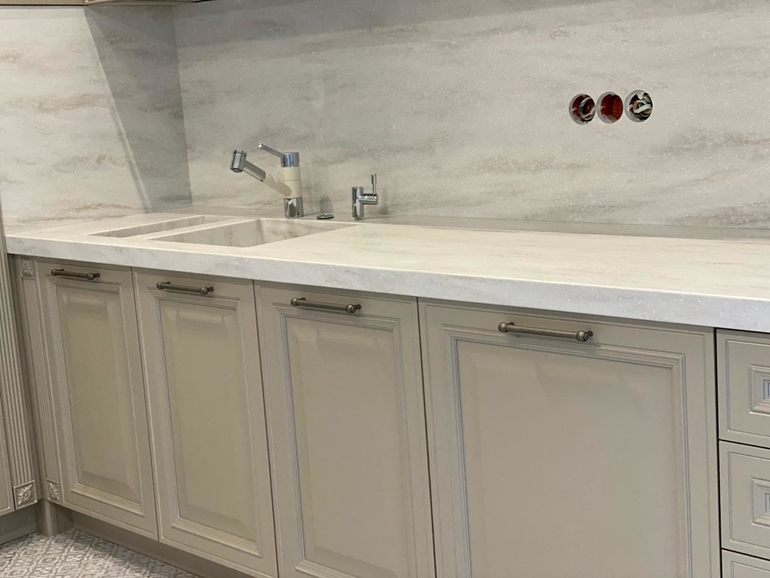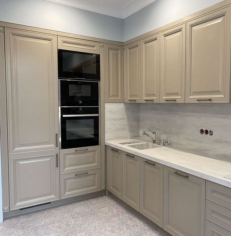 Кухня цвета кофе с молоком + серебряная патина. Сомневались мы по поводу этой патины, но вышло очень круто. Цвет стен голубой и на его фоне теплого оттенка кухня прям заиграла.