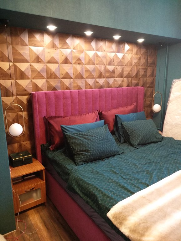 Интерьерное решение спальниДобрый день. Если муж неожиданно предложил сделать ремонт, отказываться нельзя))) Практически все закончено, осталось купить покрывало и перекрасить тумбочки. Покрывало хочу зелёное примерно как постельное бельё (обои тоже такого оттенка, но светлее - камера искажает цвета). Кровать не такая кислотная, потемнее чем на фото). Теперь вопросы: 1. Бордовые подушки - подходят или вернуть? 2. Где купить зелено-синее покрывало 260*280? (Кровать с матрасом получились 65 см, надо длинное.) 3. В какой цвет перекрасить тумбочки? (Тумбочки Икеа, одна в пленке, другая белая - экспериментировала с цветом в предыдущем ремонте.)