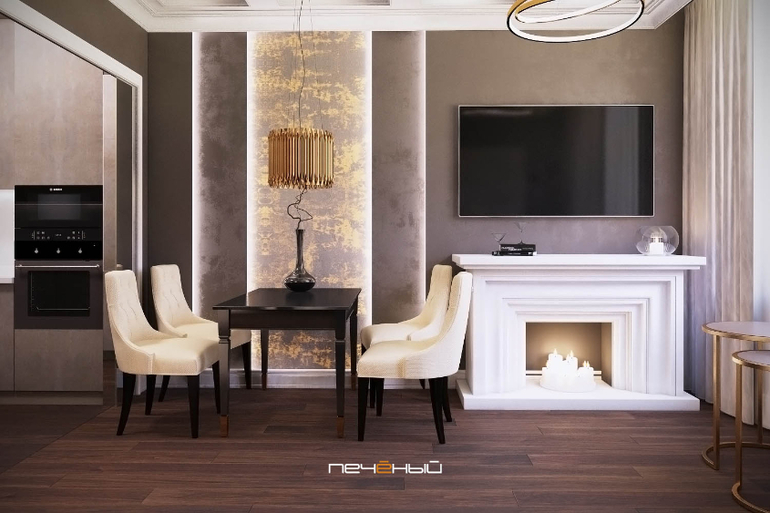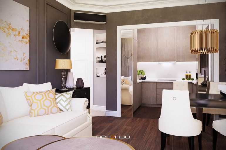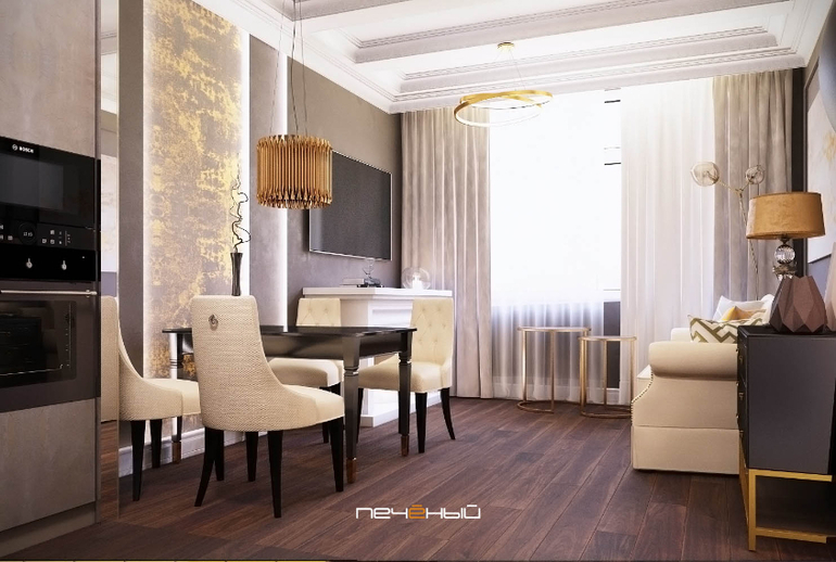 Высота стен в квартире позволила сделать кессоные потолки - элемент, добавляющий настроения в выбранный стиль в интерьере. Современная классика любит подобные украшения: молдинги, широкие карнизы с наличниками, золото. Тут главное не переборщить, чтобы не окунуться в безвкусицу. Круглая штуковина - это дорогущая музыкальная колонка, которую выбрал заказчик. Её надо было как-то разместить в комнате. Что касается картины, это не какая-то конкретная работа, а ориентир для заказчиков, чем можно украсить стену над диваном.