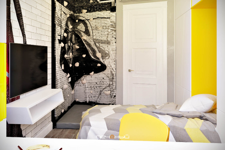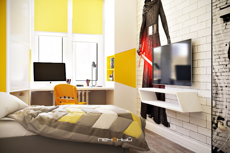 Оформление детской сильно отличается по стилю, потому что родители мудро пошли навстречу сыну, который без ума от фильма «Звёздные войны». Очевидно, что пацана 8-9 лет не интересует современная классика в интерьере)) Мальчик шустрый, активный - скалодром в комнате ровно то, что нужно ребёнку его темперамента. Таким образом мы, кстати, обыграли острый угол, который образовался в результате перепланировки коридора.