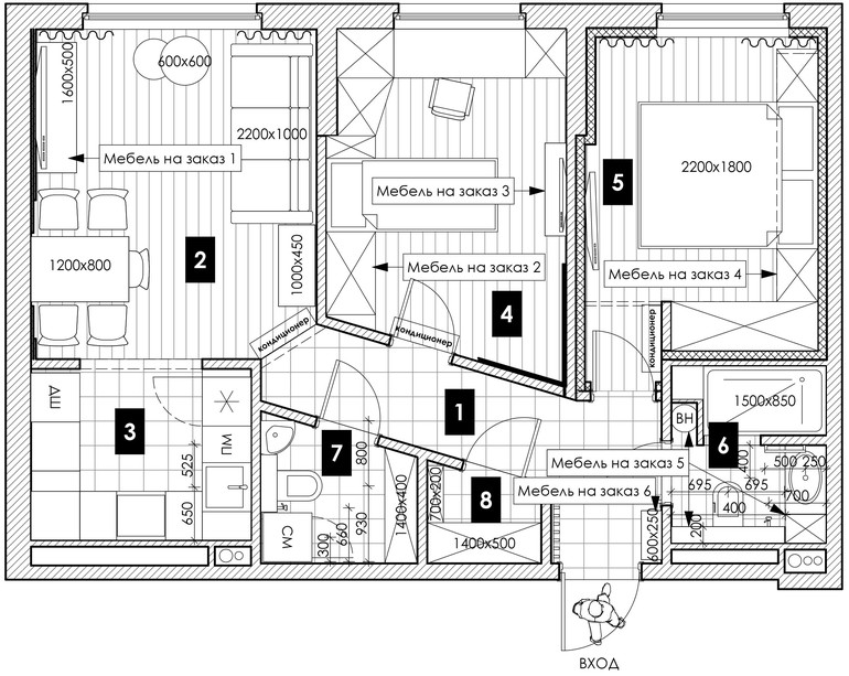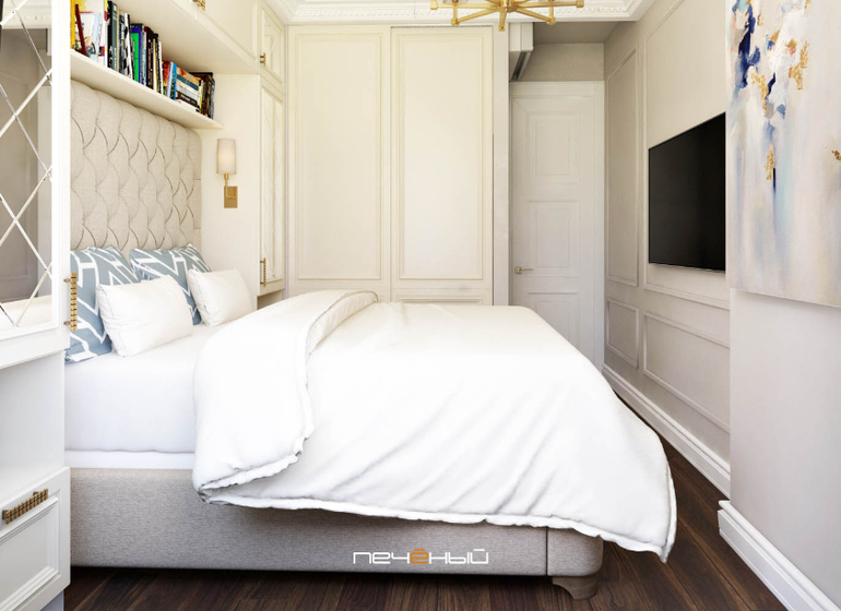 Мебель в спальне будет делаться на заказ, как и во всей квартире. Почти все позиции тут заказные, но супруги изначально были настроены на это. То есть здесь нет дизайнерского продавливания и навязывания - да его и не бывает в нашей студии, потому что перед началом работы заказчики заполняют анкету с пожеланиями.)