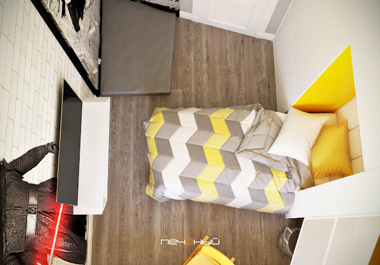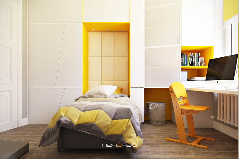 Косые линии на фасадах - это не фальш-панели, а реальные дверки, которые делают встроенный шкаф примерно на 30% дороже. Также недёшево обойдётся желание сделать кровать, которая будет подниматься и прятаться в стене. "В стене" здесь вообще будет прятаться всё - одежда, учебники, канцелярия, игрушки, все детские сокровища. Мест для хранения предостаточно! И порядок наводить легко. ;)