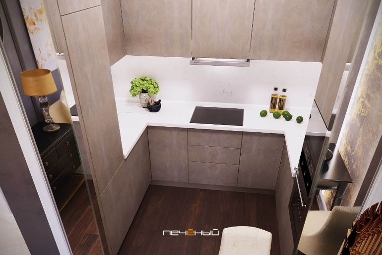 Площадь кухни чуть меньше 6 кв. м. До перепланировки вход в кухню находился там, где сейчас стоит холодильник. Благодаря П-образной форме получилось вместить всё, что хотели заказчики, и при этом сделать портал, визуально отделяющий гостиную от кухни. Обратите внимание на то, как этот портал оформлен: наличники идут не по краям короба, а со смещением в стороны, оставляя место для зеркальных вставок. Это визуально расширяет вход, делает его менее зажатым.