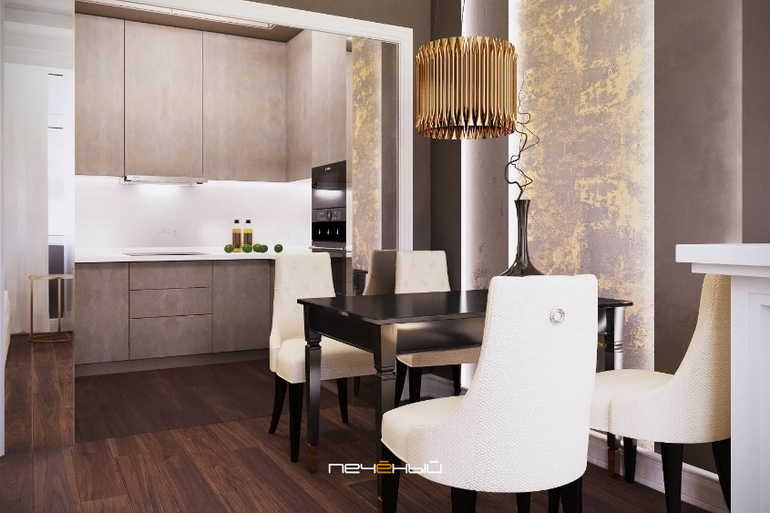 Чтобы интерьер не смотрелся скучным, берите сложные оттенки и используйте игру материалов. Сизо-серые градации цветов в сочетании с золотом смотрятся строго и элегантно. Краска с эффектом бархата, декоративная штукатурка, кухня с фасадами под камень травертин - такое разнообразие материалов создаёт ощущение наполненности интерьера деталями, делает его продуманным и глубоким.
