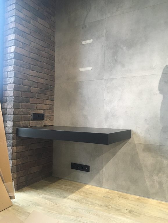 очень часто такая конструкция встречается на красивых картинках (визуализациях). А вот когда дело доходит до реализации, оказывается, что все не так просто. Нельзя просто прикрутить столешницу к стене. Столешница просто не выдержит.