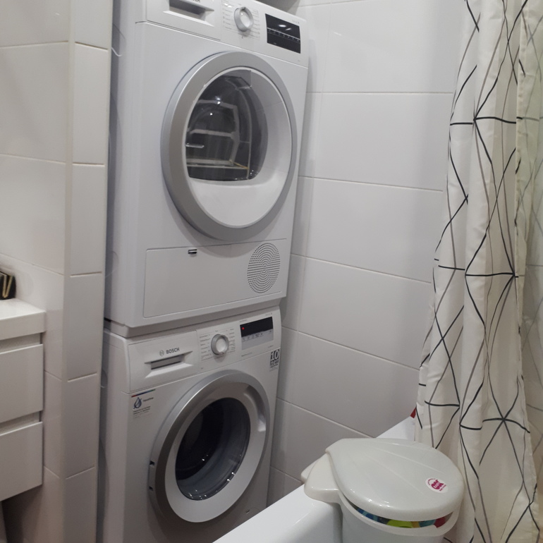Ставили сначала поотдельности, место позволяет. Неудобно. Надо таскать постиранное из стиралки в сушилку и кроме того - выливать конденсат. Поставили в колонну, в коридоре, подосединили сушилку к канализации - вообще никаких проблем.