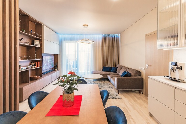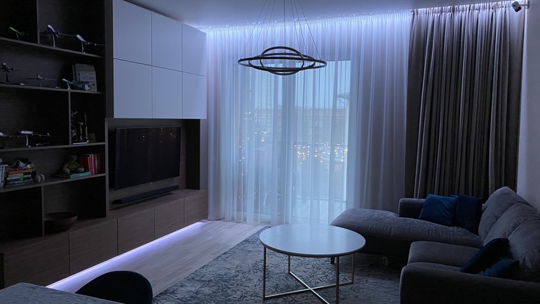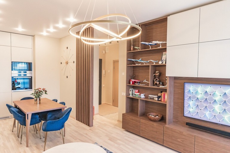 Я понимаю насчёт полок, не люблю такие, как в народе говорят, «стенки». Единственное, что не по-моему вкусу- это объединённая гостиная/кухня и натяжные потолки