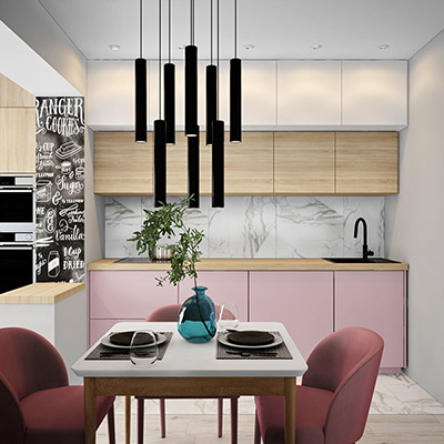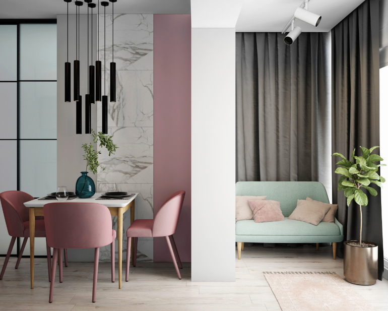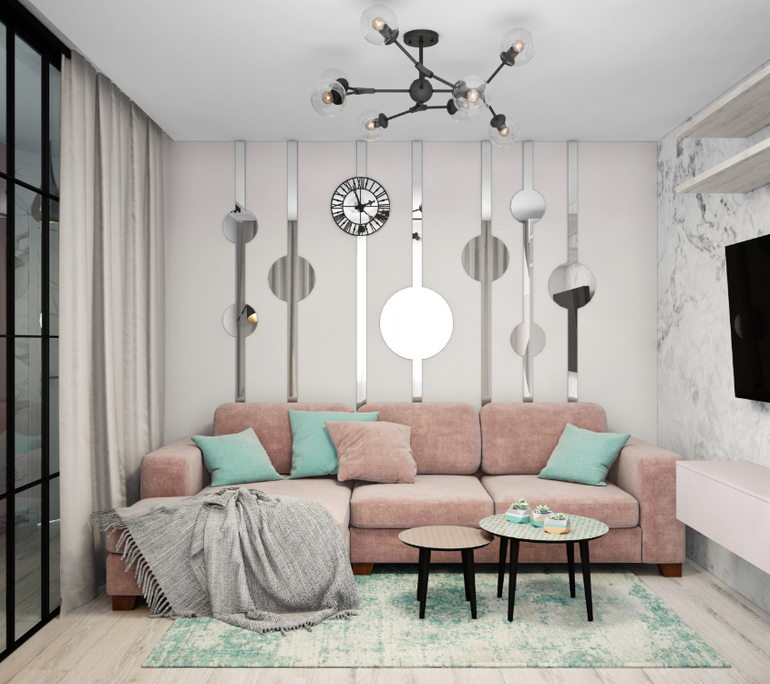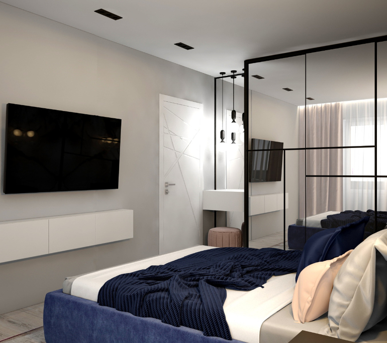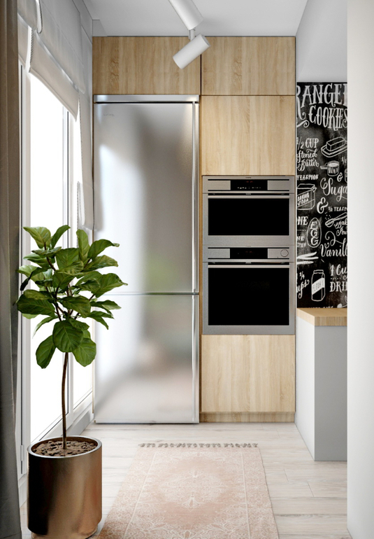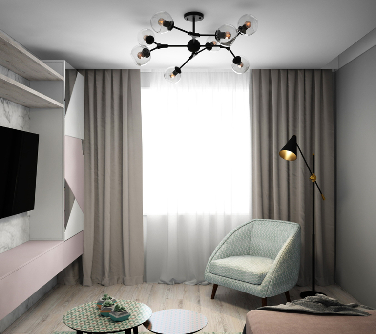 Нужно было обеспечить достаточно зон хранения вещей. Также сделать удобную гостиную, чтобы для мамы там было достаточно уютно ночевать, а днем эта была полноценная общая зона гостиной. Приоритет, чтобы ТВ было видно из кухни.