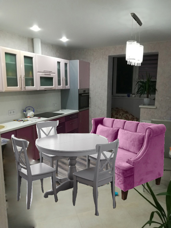 Интерьерное решение кухниВсем привет! Выбираем диван на кухню, нужен ваш совет. Диван присмотрела сиреневый, но боюсь, что будет перебор с цветом.