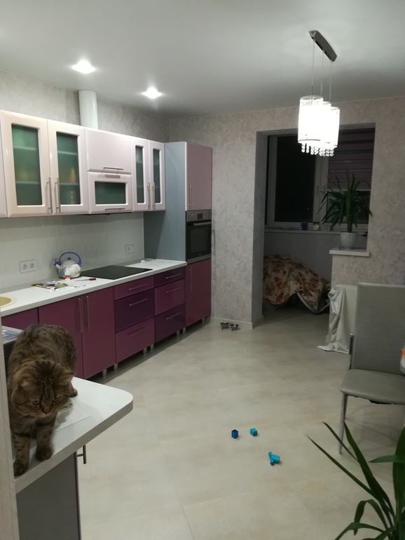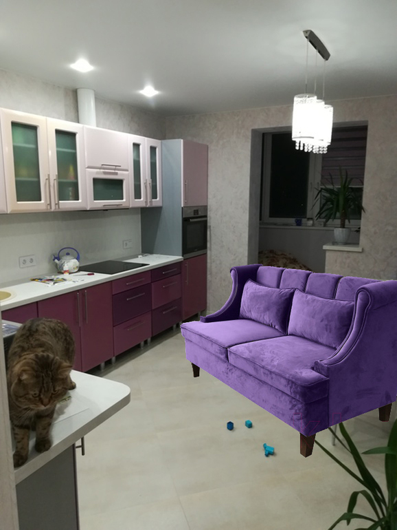 не ваш вариант однозначно. кухня дешевит сильно, ищите попроще . Цвет дивана я бы серый взяла, сиреневого трех оттенков достаточно уже, добавите подушки или салфетки сиреневые.