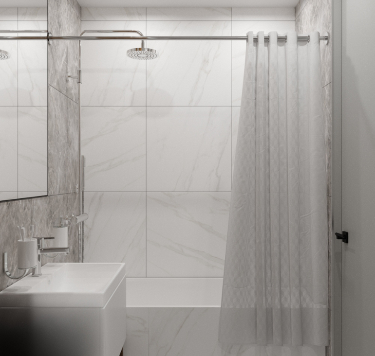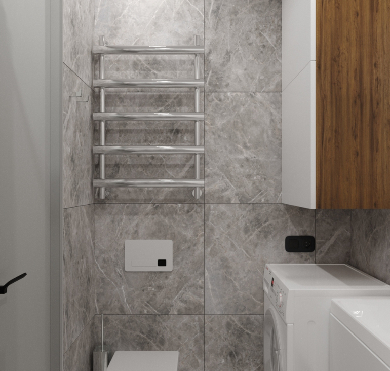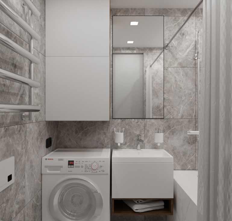 Туалет и ванную объединили. Разместили стиральную машину и навесной шкаф с местом хранения.