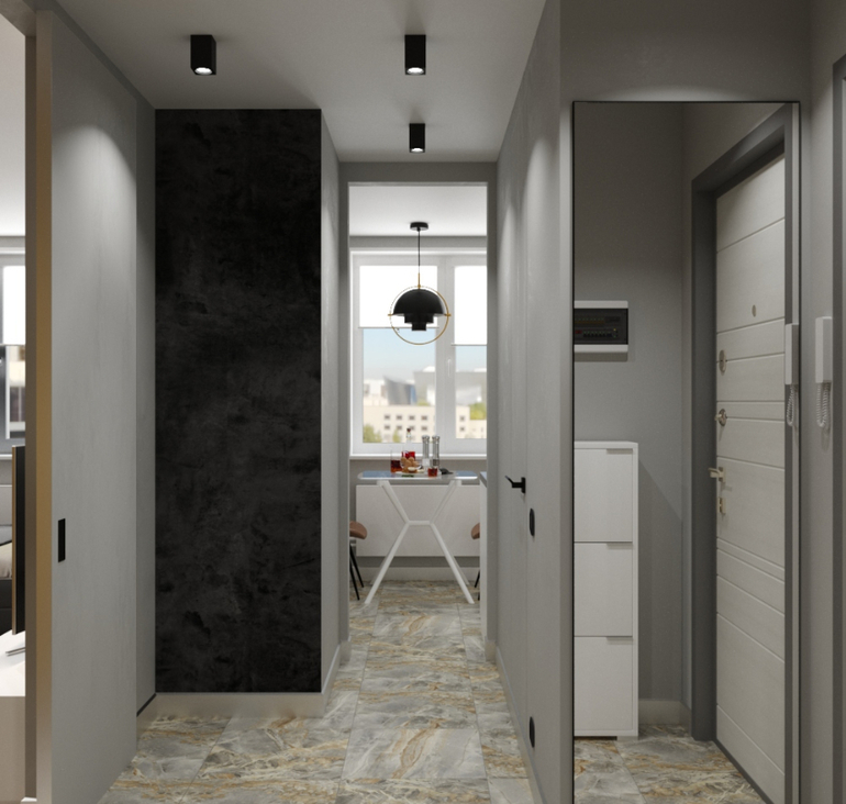 Основной и любимый цвет заказчика-черный. Необходимо было отделить зону спальни от гостиной. Основательную перегородку заказчик не хотел, визуально разделили перегородкой. Двери не стандартной высоты, высокие 2400 мм. В санузле скрытого монтажа, в комнату раздвижная.Кухня с газовой плитой необходимо закрывать дверью, но заказчик добровольно отказался и пожелал открытый проем.