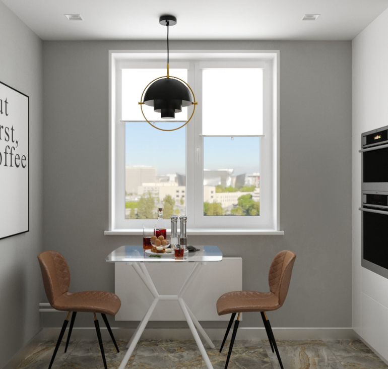 Прямые шторы, текстиль заказчик не любит. Окна оформлены только рулонными шторами. Первоначальный вариант гостиной был такой