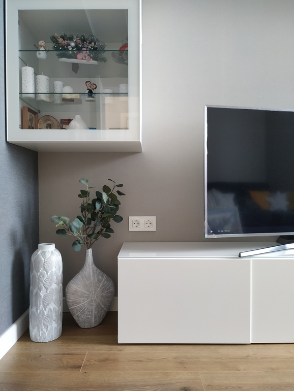 В глаза сразу бросились розетки над телевизором и провода возле него... Сам интерьер в визуализации красивый и стильный. А в реализации скучный и какой то обычный что ли(