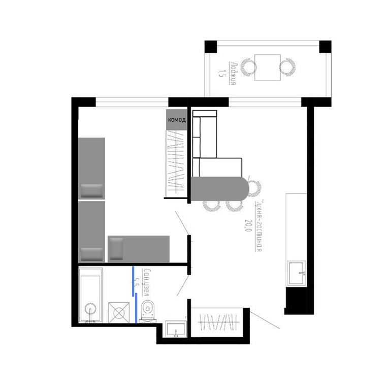 Санузел - 5,5м это хорошо, но я могу пожертвовать этим местом под стиралку в пользу жилого пространства.