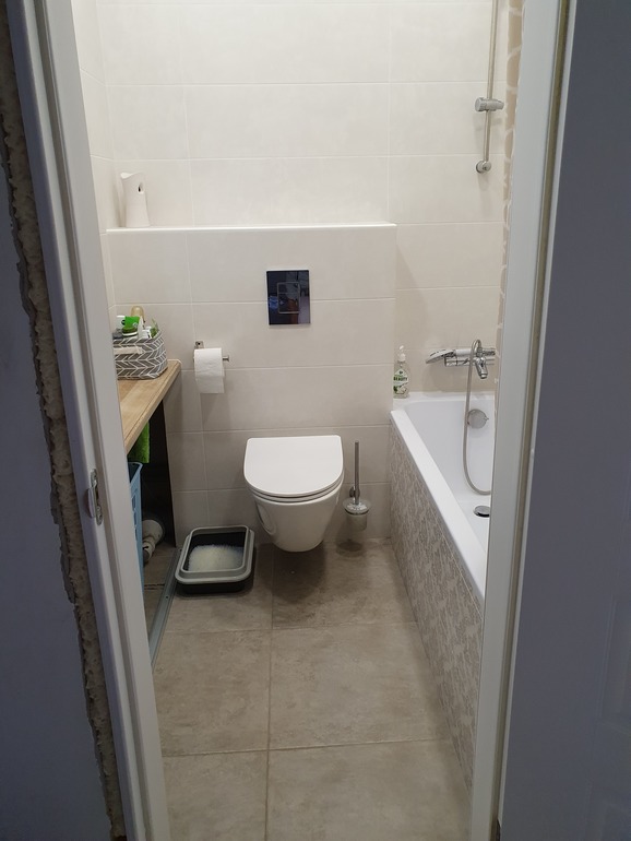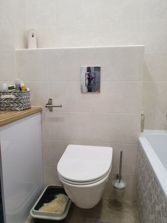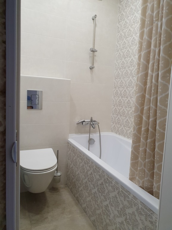 Понравилась планировка, плитка на стенах, качество укладки, столешница, внутреннее наполнение. Дверцы белые хорошо, но не глянцевые.