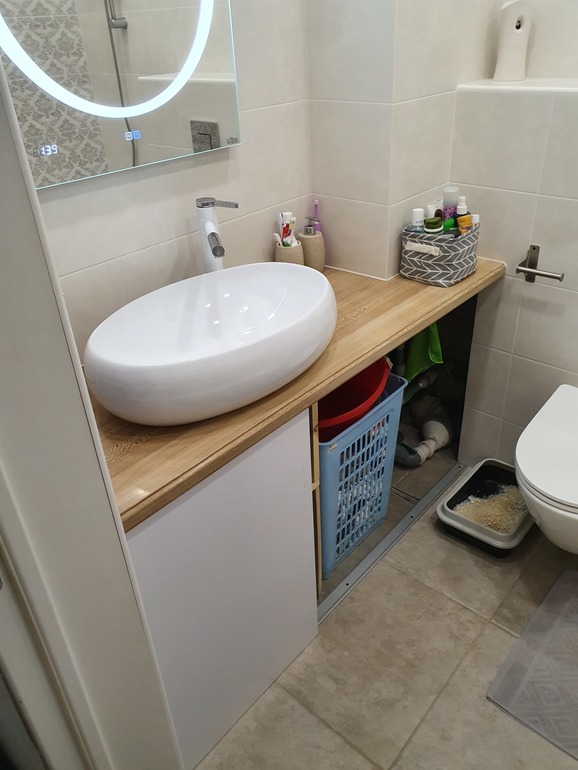 Интерьерное решение ванной комнатыДобрый день! Единственная комната в квартире которая готова-ванная, единственный вопрос который остался-дверки под столешницу, их планируется две, но белая?/матовая?/под цвет столешки? вот в чем вопрос) какая лучше подойдёт? Приложила белый кухонный фасад, как смотрится мне нравится...