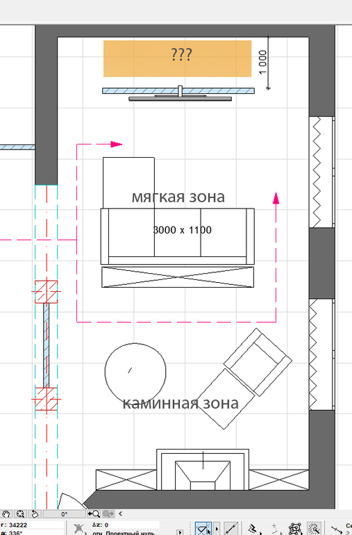 Есть готовый дом, вот такая там гостиная с каминной зоной. Заказчики хотят разделить ее на каминную и мягкую зону, что логично. И есть у меня в голове такой вариант разделения, но лишний метр от длины этой гостиной остается. (Понятно, что можно телек больше повесить, диван подвинуть и т.д. - это в других вариантах планировок есть). Такая скрытая часть.