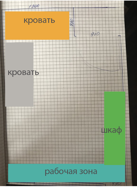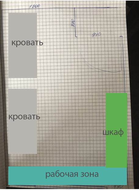 В нише точно шкаф-купе, на остальном пространстве надо уместить два спальных места и рабочую зону (скорее всего у окна)