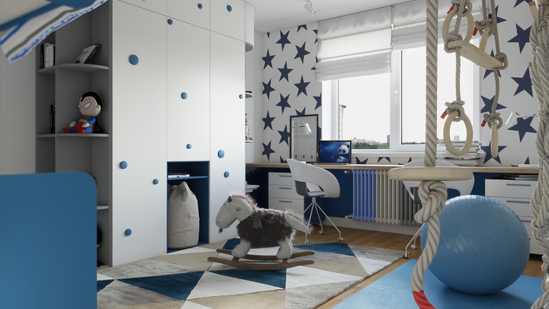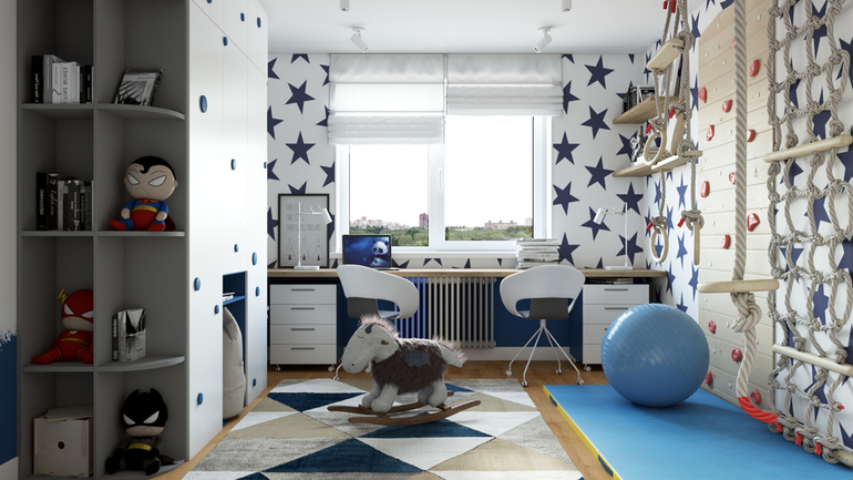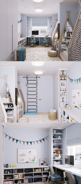 я тоже голосую за большое рабочее место у окна во всю стену, со стеллажами. Шкаф в нишу, кровати друг напротив друга. Хранение игрушек - под кроватями и на стеллажах.