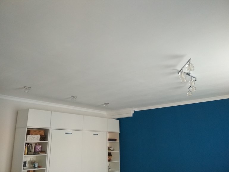 Думается, в зоне "спальни" шт 6 поворотных точечных светильника ( отрегулировать, чтоб в глаза не светили), а что в гостиную? Или 2 одинаковых люстры/потолочных светильника?