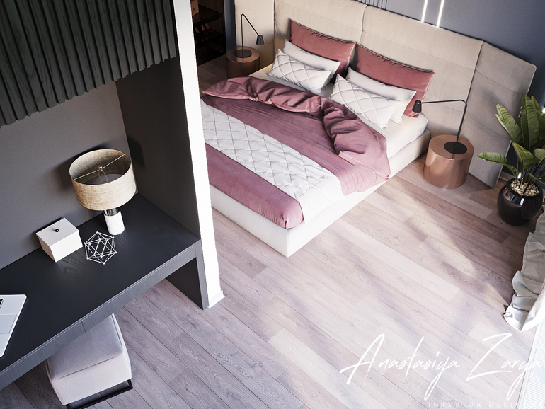 Не увидела мастер-спальню. И для проектора, на мой взгляд, слишком близко кровать.