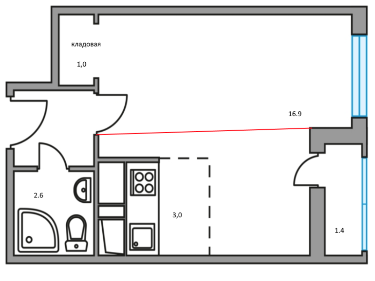 Вопросы и ответыПосоветуйте? пожалуйста. Стоит ли делить студию стеной (красная линия)?