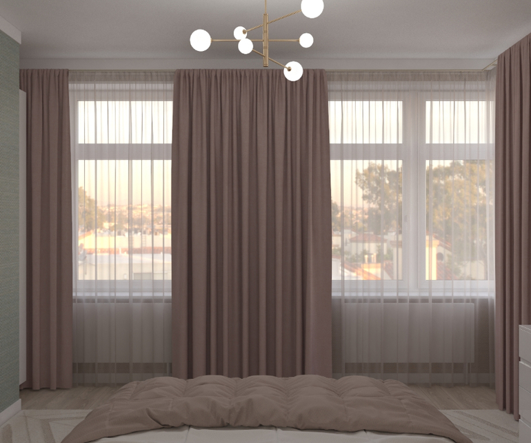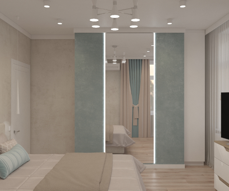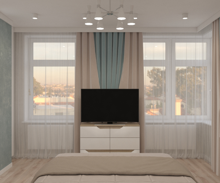 Начнем со спальни) Здесь была использована спокойная гамма, на стенах штукатурка.