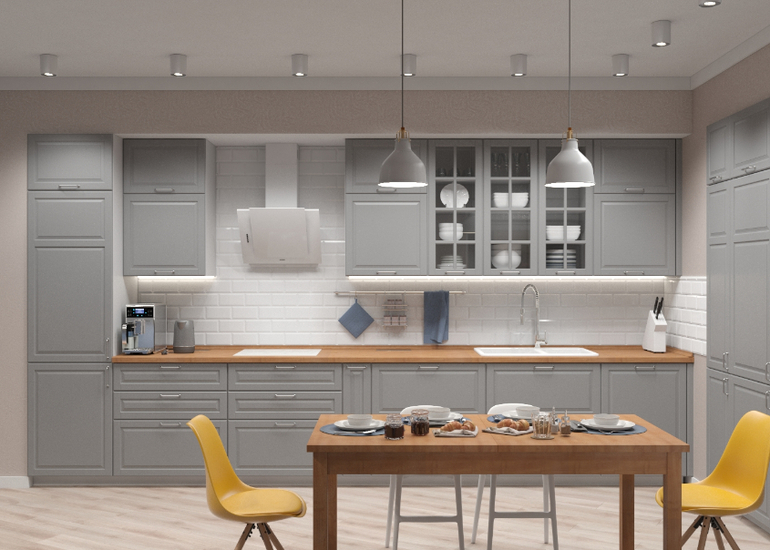 Только во второй кухне, которая в современном стиле, если фасады складываются гармошкой, то антресоль скорее всего будет мешать.