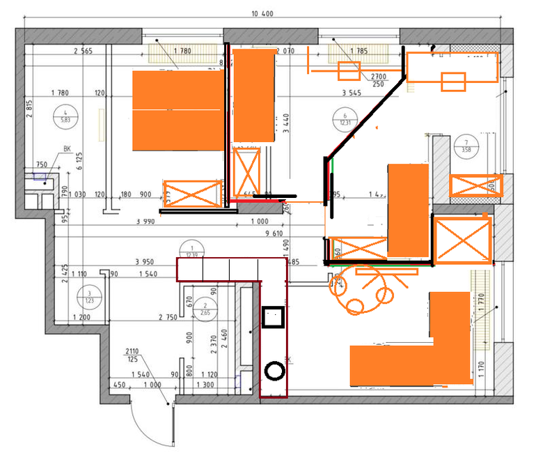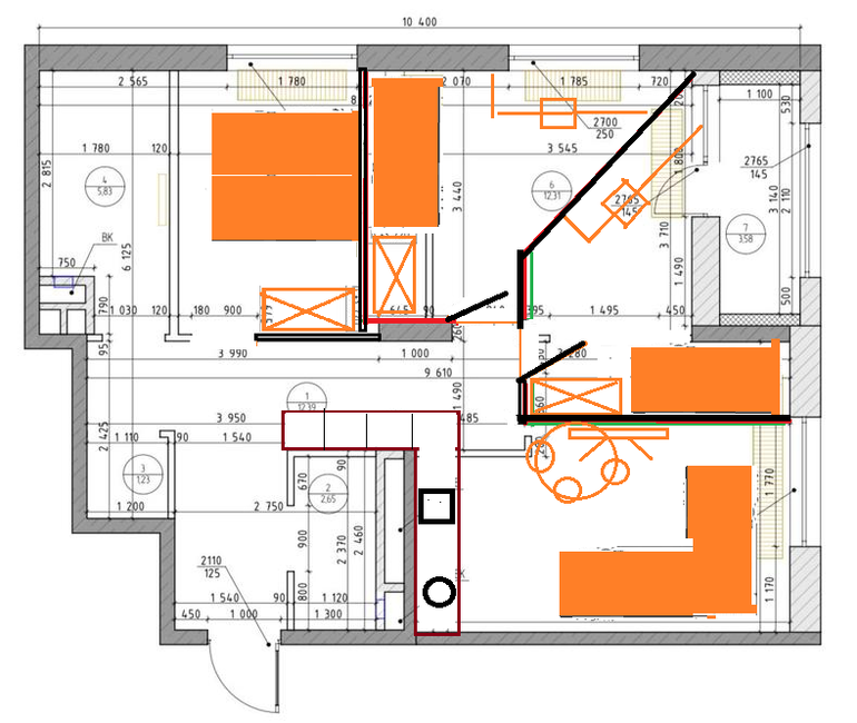 Вопросы и ответыГолову ломаю, возможно ли с такой планировки сделать трешку. Вроде идеи есть, но наверное вряд ли получится это узаконить, да и спальня одна все равно слишком маленький получается... Нужно 3 спальни и кухня-гостиная не огромные...