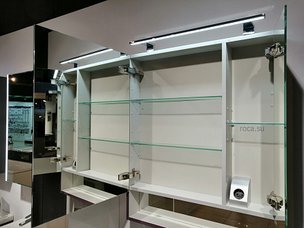 У меня такой шкаф ширина 60 см. Одно сплошное зеркало . Точно помню, что у ROCA были шкафы и 80 см. Как по мне, очень удобно. Ничего не пылится, внутри полочки выставляются на нужную высоту.