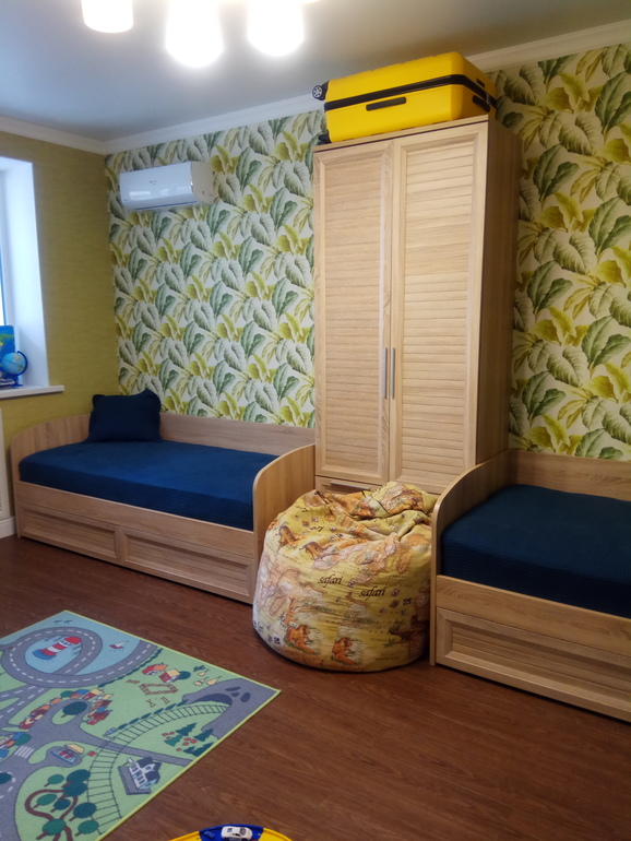 Мои сейчас в одной комнате пока. Обои белые однотонные. У дочки над кроватью наклейки Эльза, у сына тачки. Кровать у дочки бледно-розовая ( она попросила, я хотела белую), у сына серая. Белый шкаф, ковёр и шторы серые. Вроде и нейтрально и в тоже время у каждого своя тематика. Вам бы тоже посоветовала белые или серые однотонные, они с любыми наклейками сочетаются. А наклейки следов не оставляют. Снял и можно кукол/монстров/кошек лепить заново или вообще ничего если надоели))