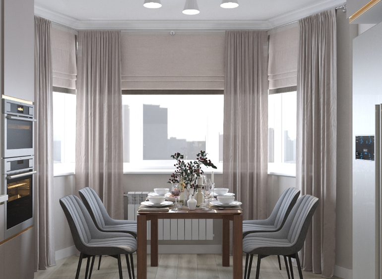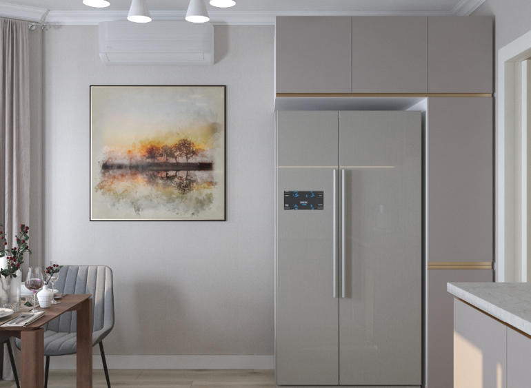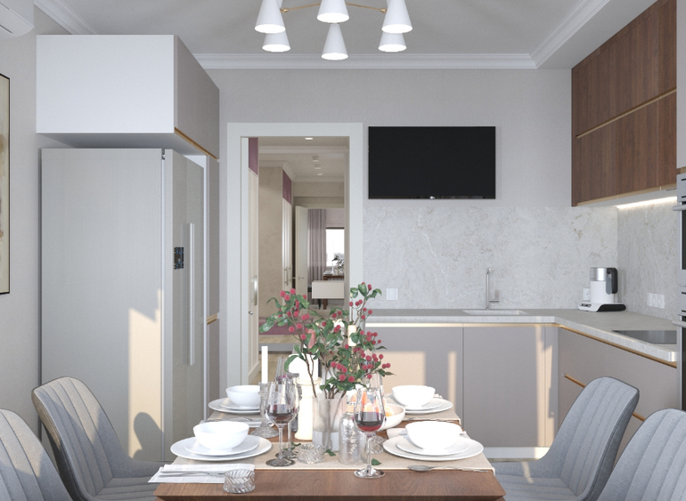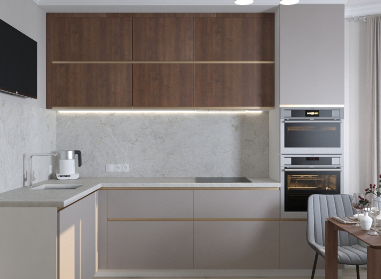 Пожелание от заказчиков спокойная,теплая цветовая гамма, большой холодильник, фартук и столешница из кварца.
